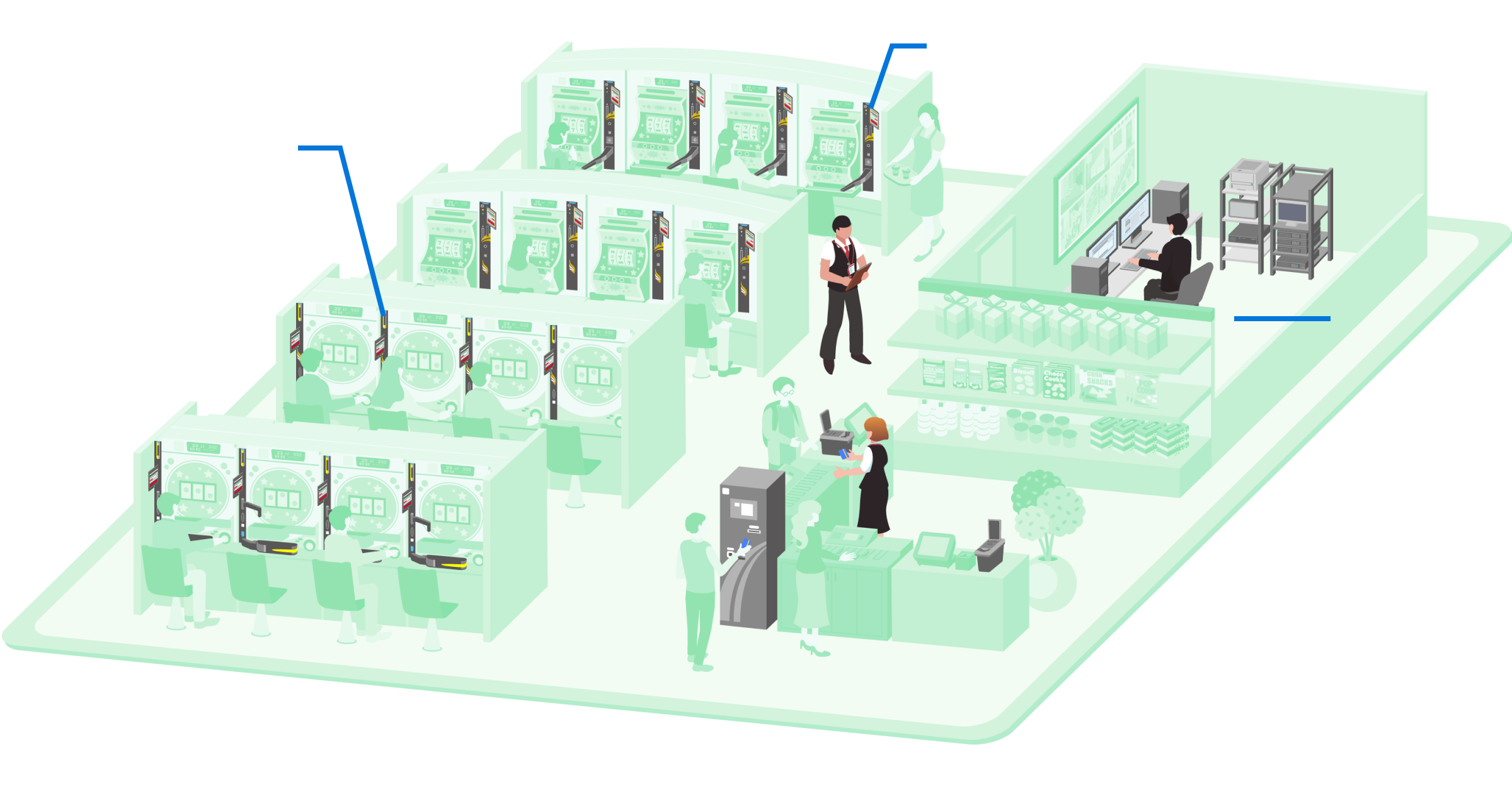パチンコ台・スロット台に取り付けて利用する機器(ICカードシステム)およびその周辺機器を開発・販売しています。台ごとに正確に出玉を数えることができる機能(各台計数)やホール内の様々なシステムと連携しながら会員さまの情報を管理・記録する機能など、パチンコホール様が経営を続けるにあたって、欠かすことのできない製品・システムをご提供しています。